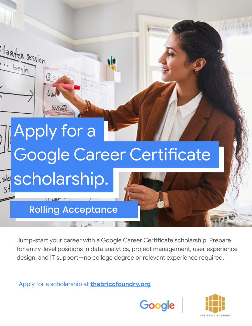 In partnership with Google, BRICC offers free scholarships to earn Google Career Certificates in high-demand fields like Project Management, UX Design, and AI Essentials.